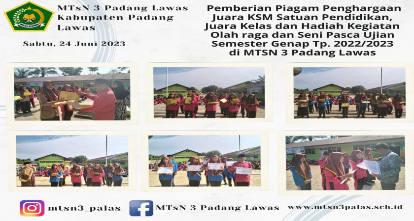 Pemberian Piagam Penghargaan Juara KSM Satuan Pendidikan, Juara kelas dan Hadiah kegiatan Olah raga dan Seni Pasca Ujian Semester Genap TP. 2022/2023 di MTsN 3 Padang Lawas (24/06/2023).